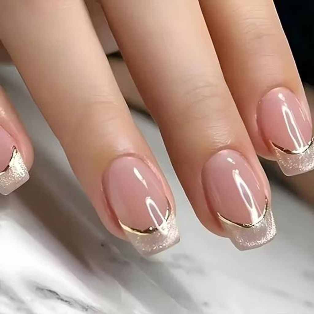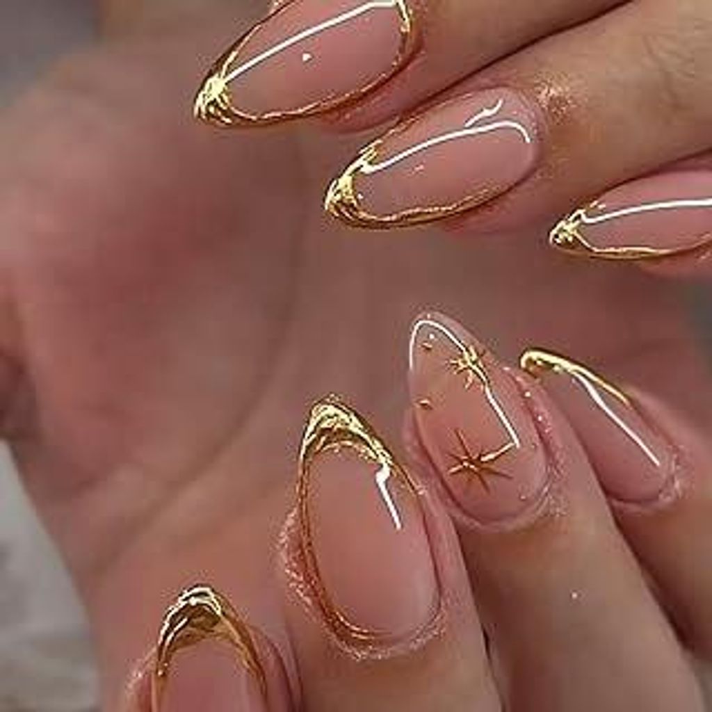 Viugex 24 Stück Mandel Press on Nails, Kurz Nude Rosa Nägel Zum Aufkleben, 3D Gold Natürliche Acryl Künstliche Nägel, Elegante Sterne Full Cov...