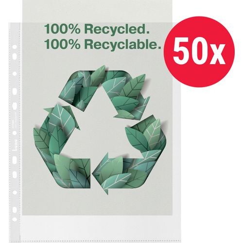 Bene Premium Prospekthüllen 100% Recycelt DIN A4 Genarbt Transparent 100 Mikron PP (Polypropylen) Öffnung oben und recnts 11 Löcher 217300 50 Stück