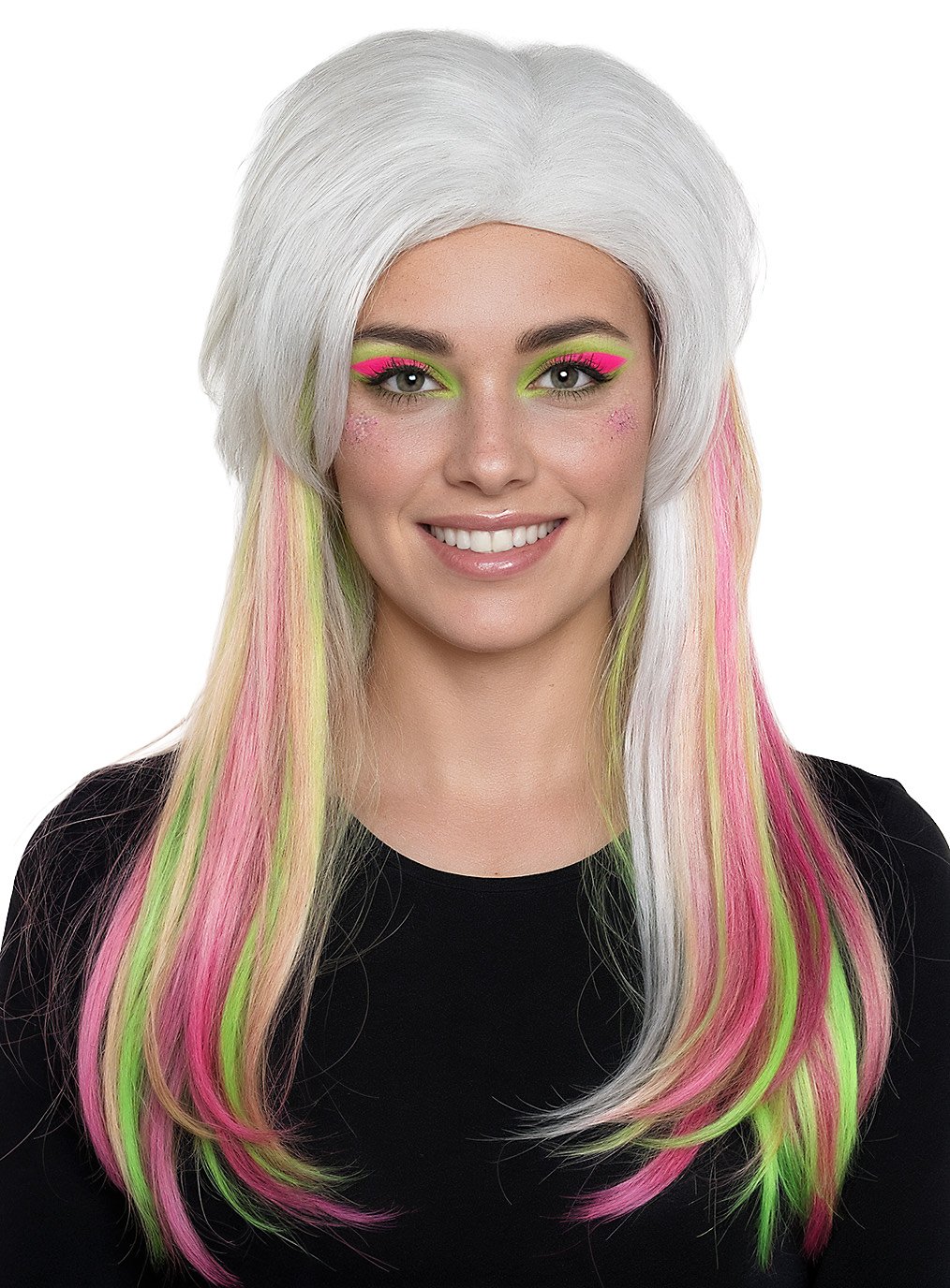 Witte langharige pruik met neonkleurige strengen