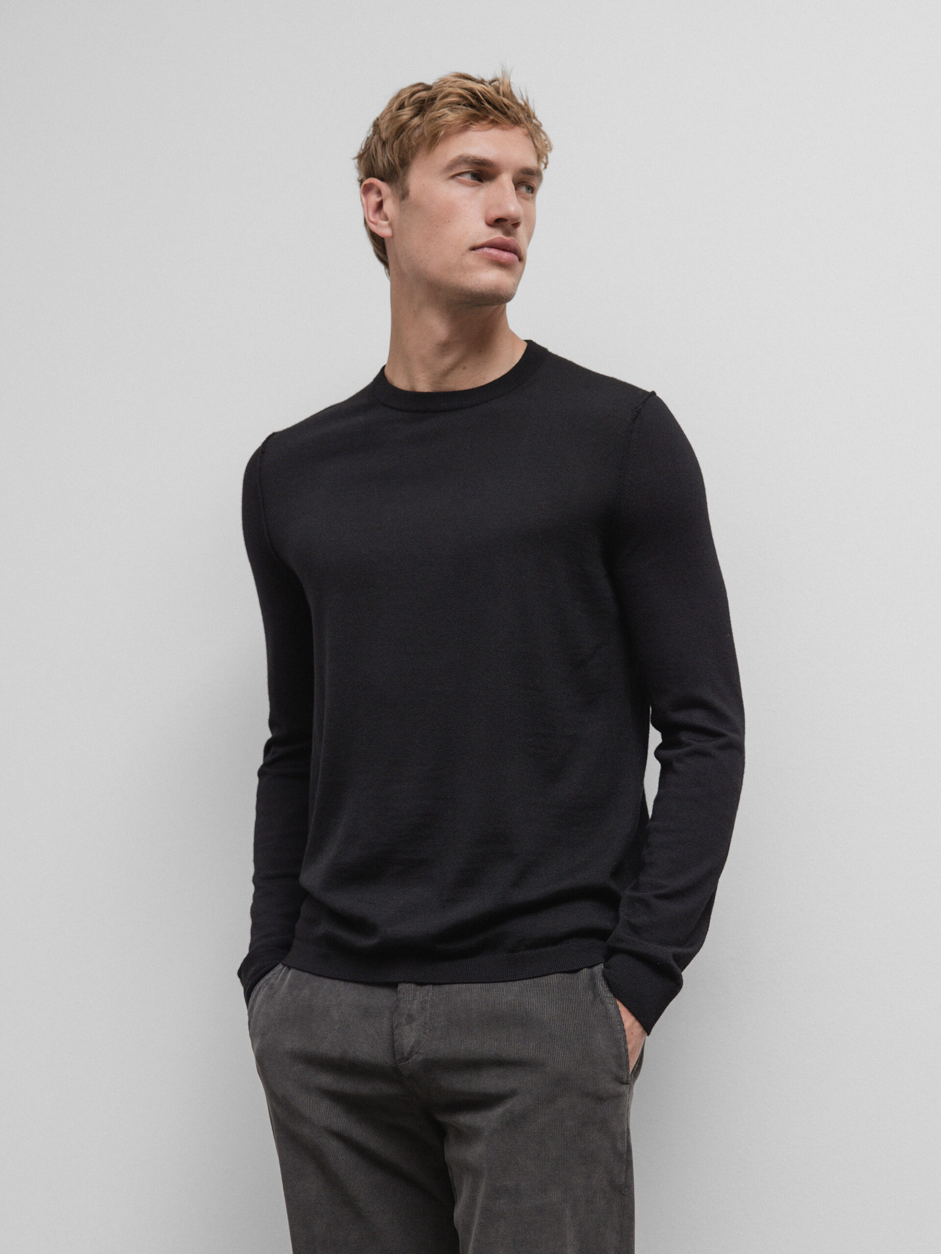 Herren Maerz Rundhalspullover Schwarz Regular Fit Pullover / Strickpullover / Merinopullover superwash (maschinenwaschbar) Merinowolle Klassisch /
