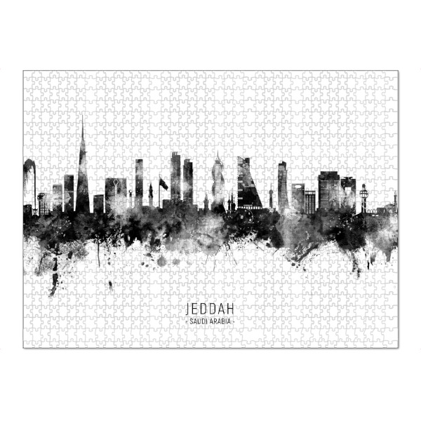 Puzzle Ravensburger "Jeddah Skyline BW Text" artboxONE - Städte,Schwarzweiß - Jeddah,Saudi -arabien,Skyline,Stadtlandschaft,Stattbild,Aquarell,Malerei