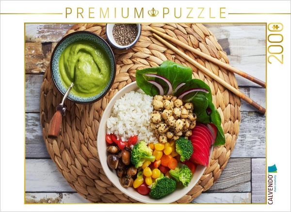 CALVENDO Puzzle Vegane Bowl mit Kichererbsen, Mais, Paprika, Avocadodip, Karotten, Brokkoli, rote Beete | 2000 Teile Lege-Größe 90x67cm Foto-Puzzle fü