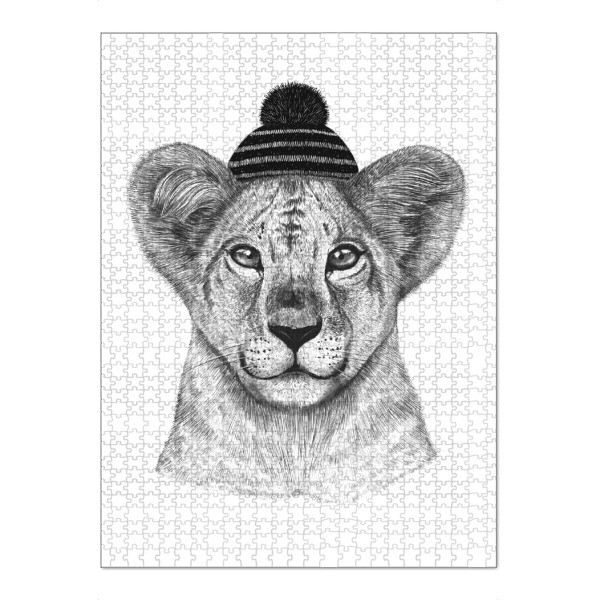 Puzzle Ravensburger "Kid lion in winter hat" artboxONE - Tiere,Schwarzweiß,Weihnachten,Lustig