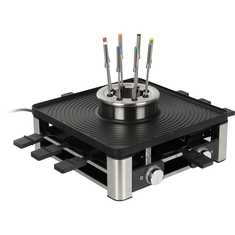 MAXXMEE Raclette- & Fondue-Set Antihaftbeschichtete Grillplatte integrierte Heizzone Fonduetopf Fettarm Grillen 8 Raclette-Pfännchen 6 Fonduegabeln