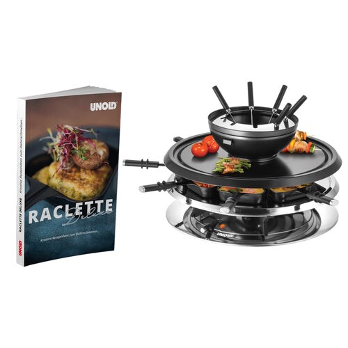 Unold 48926 Raclette Multi 4 in 1 inklusive Raclette Buch für 8 Personen, wendbarer Antihaft-Grillplatte mit Fonduetopf