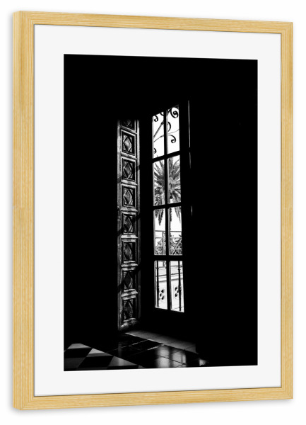 Poster mit Rahmen kiefer "Blick nach draußen" artboxONE - Reise,Schwarzweiß,Architektur - Fenster,Aussicht,Blick,Schwarz-weiß,Schwarz,Weiß,Reise