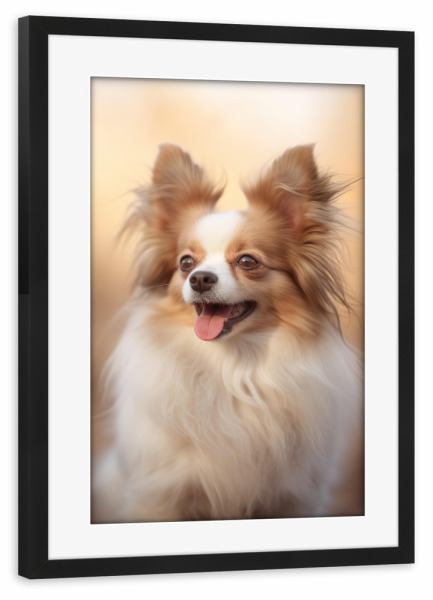 Poster mit Rahmen schwarz "Glücklicher Papillon" artboxONE - Tiere - Tier,Bokeh,Niedlich,Hund,Glücklich,Papillon,Fotografie,Porträt,Lächelnd,Weiß