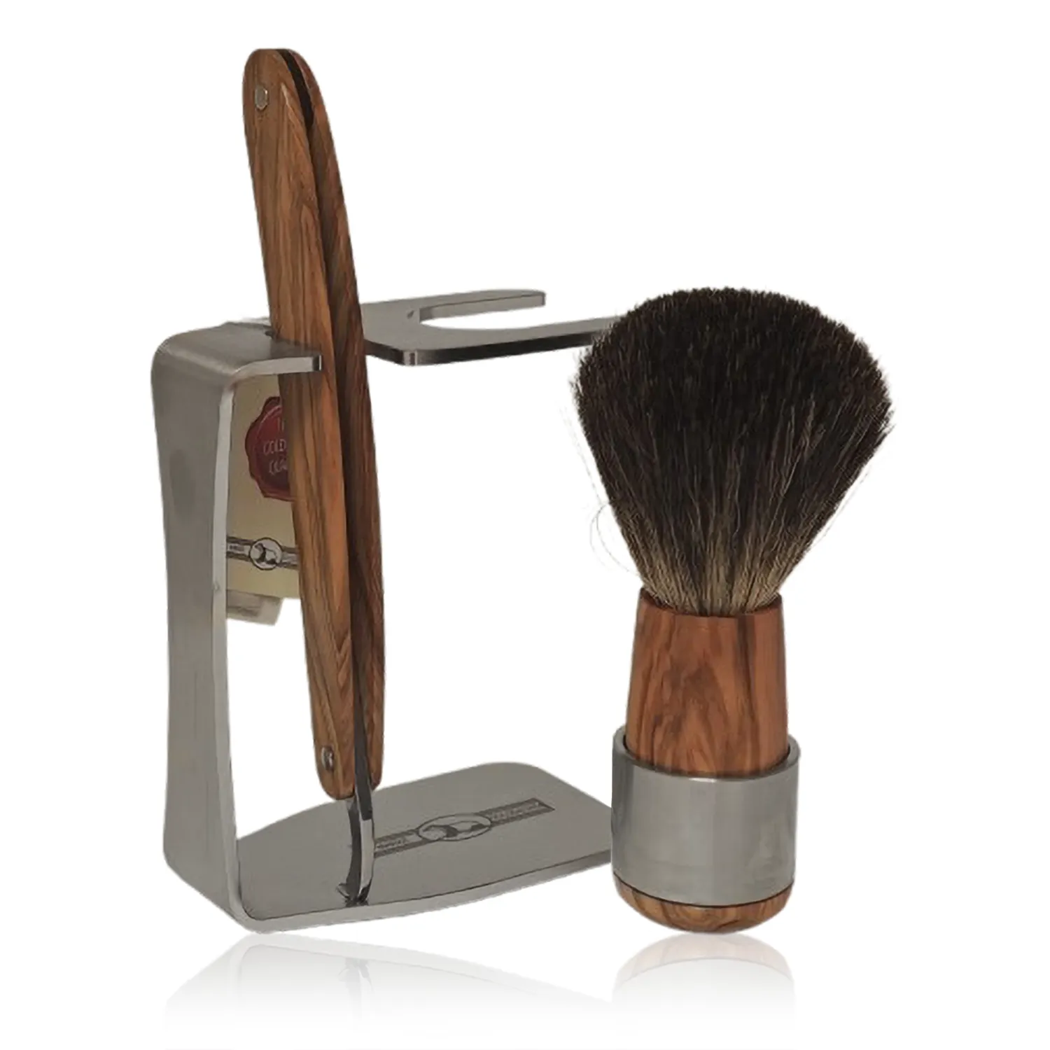 Golddachs Rasier-Sets Rasierset Olivenholz/Edelstahl mit Rasiermesser & Dachshaar-Pinsel (3-teilig)