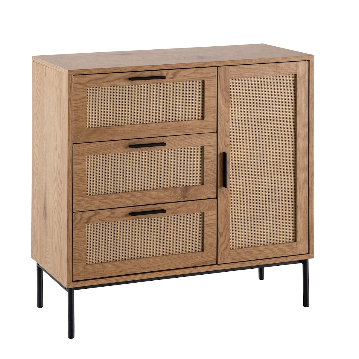 KADIMA DESIGN Kommode 80x82x36 cm Flurkommode Eiche-Dekor & Rattan, Sideboard mit drei Schubladen und Tür, Kommodenschrank Modern, Standschrank