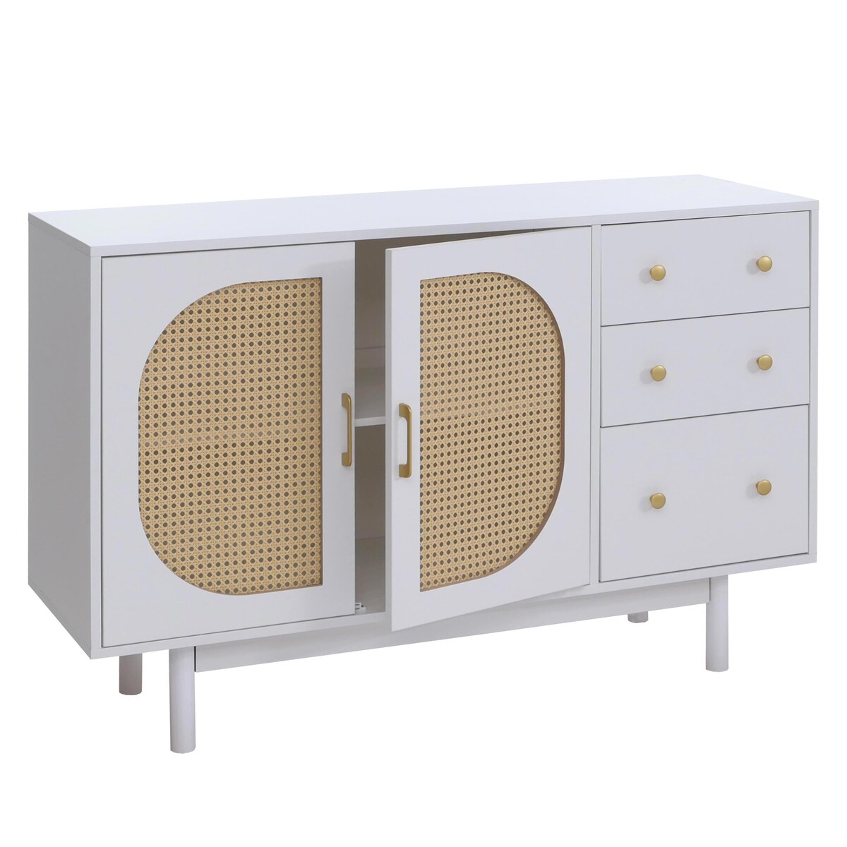 MODFU Kommode Sideboard mit 3 Schubladen und 2-Rattan-Türer, Schrank Buffet mit Metallgriffen und erstellbare Fächer für Wohnzimmer, Schlafzimme...
