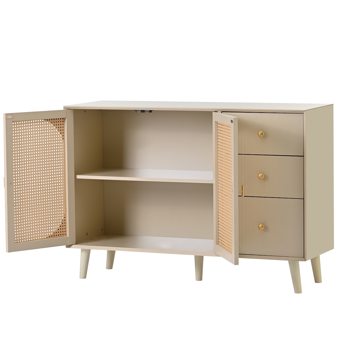 Kommode Verstellbare Ablage Sideboard mit 3 Schubladen und 2 Türen Rattan Wohnzimmerschränke Massivholz, für Esszimmer Wohnzimmer Schlafzimmer