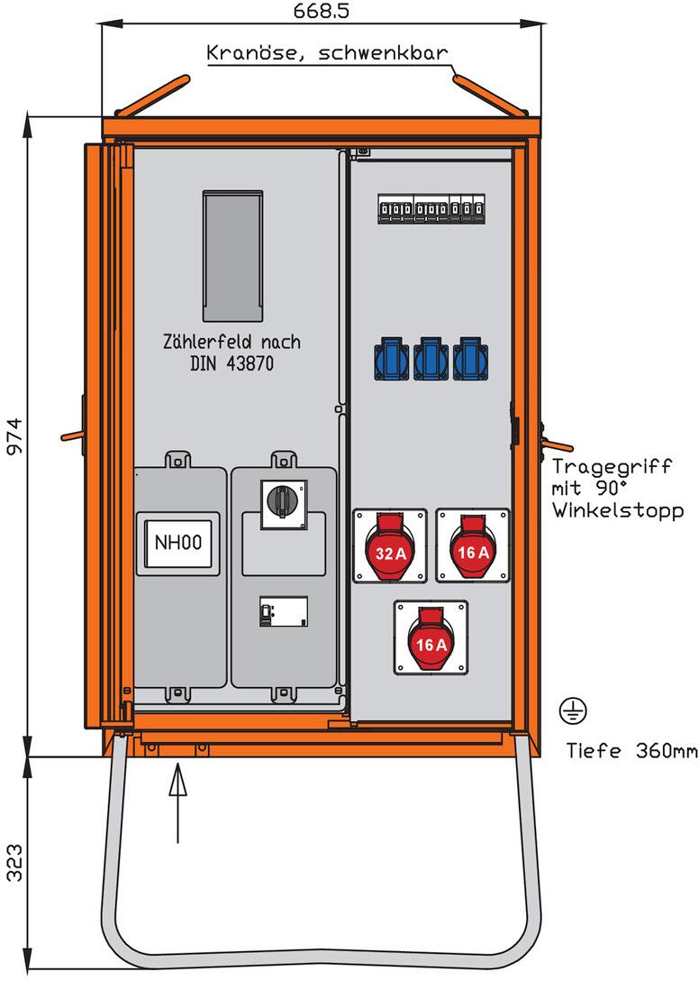 Walther Werke WAV0160BR1 Anschlussverteilerschrank, 44kVA, mit Zählerplatz, RCD Typ B, 5 LS, 3 CEE-Abgänge 16-63A und 3 Schukos