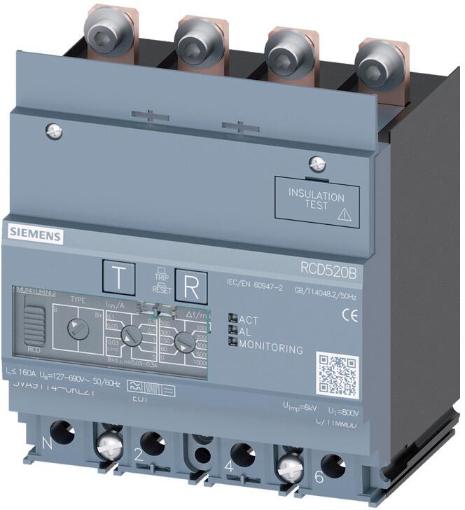 Siemens 3VA9114-0RL21 Differenzstrom-Schutzgerät RCD520B Basic RCD Typ B oder B+ unten angebaut Bemessungsfehlerstrom 0,03...5A einstellbarer tv 0...1