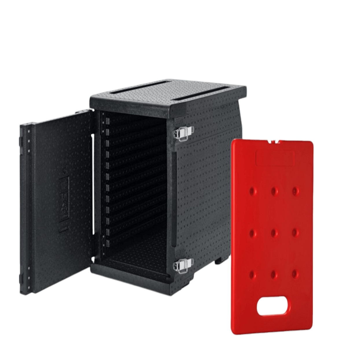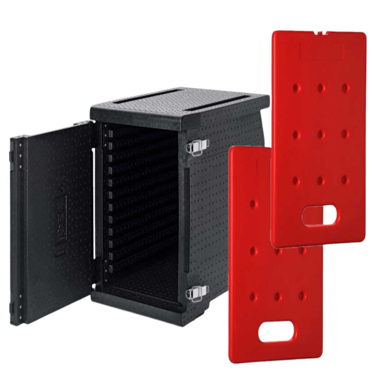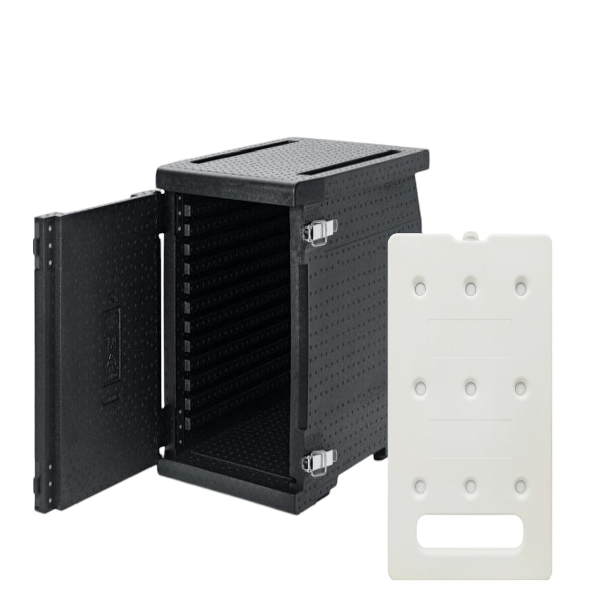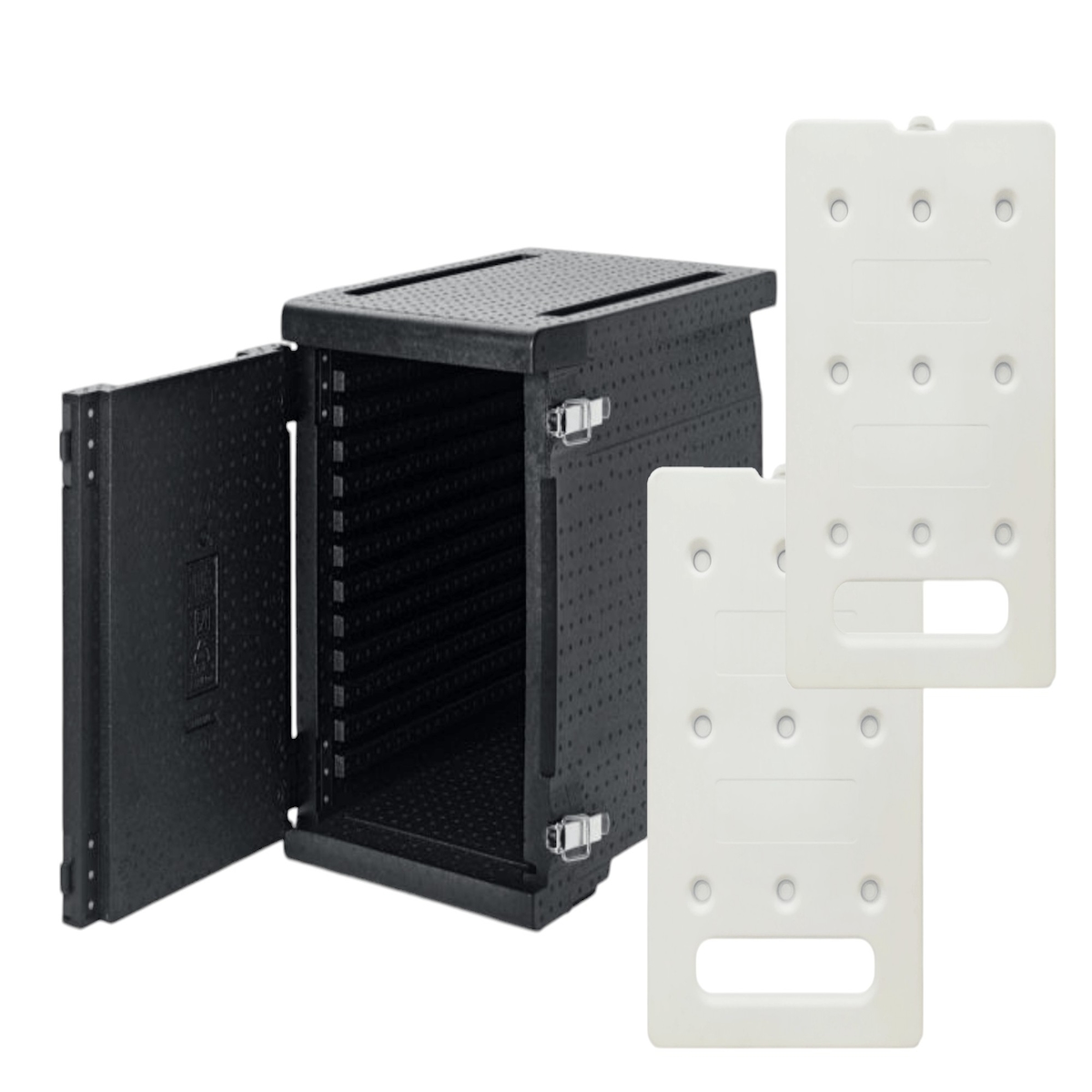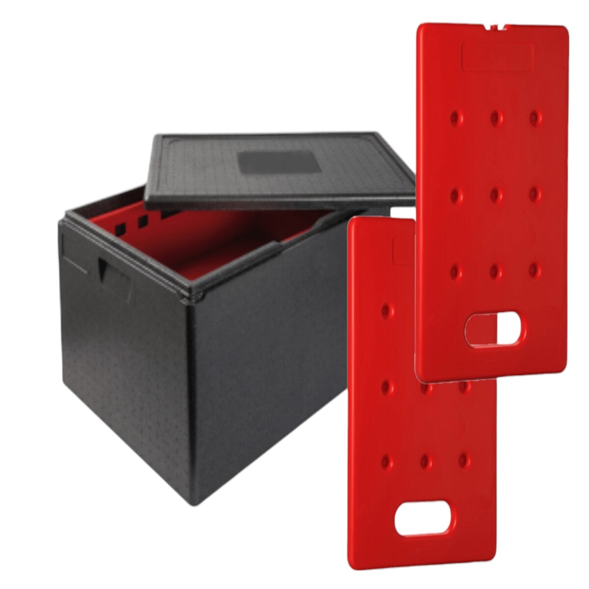 KIT QUENTE - 1 recipiente isolado PPE 93L - Abertura frontal - Tamanho adequado para tabuleiro GN 1/1 + 2 placas eutécticas quentes GN1/1 4kg