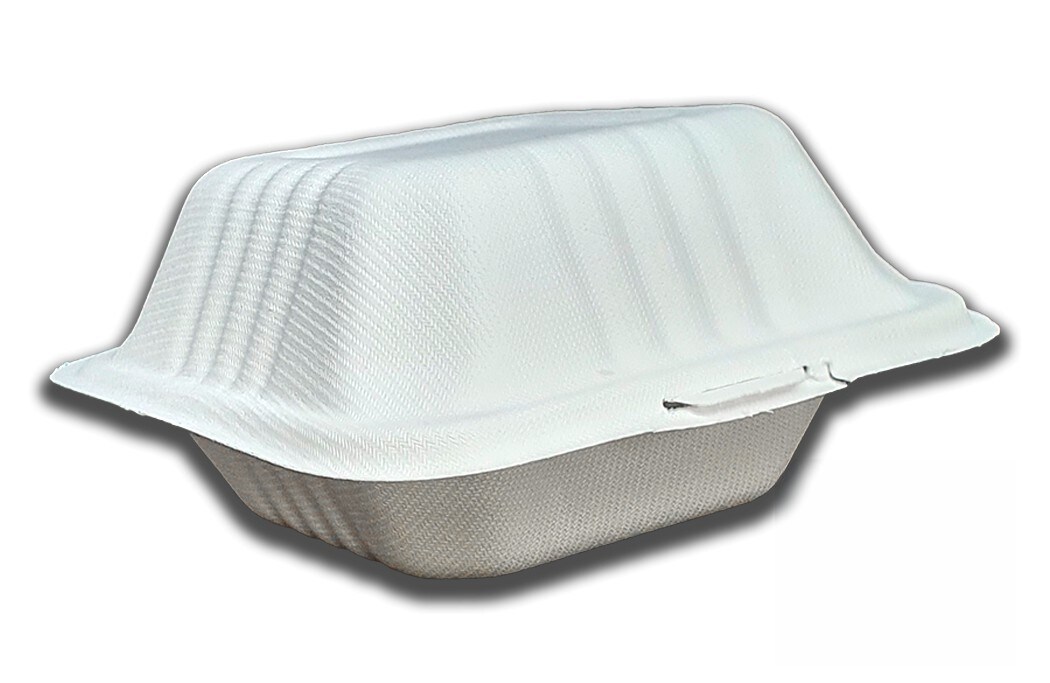 Recipiente para hambúrguer de 15x15x8 cm feito de cana-de-açúcar branca. Embalagem do cardápio