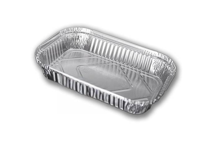 Recipiente retangular de alumínio de 1,5 litros, com borda elevada e curvada. Caixa com 5 embalagens de 100 containers.. Modelo: ECA008