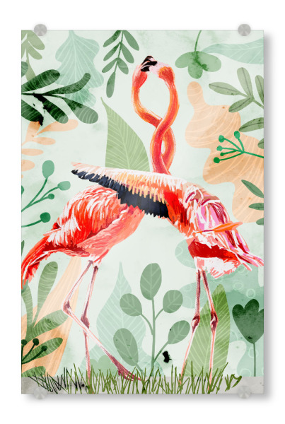 Acrylglasbild "Flamingo Love" artboxONE - Tiere,Liebe - Flamingo,Tropical,Nature,Animal,Bird,Travel,Exotic,Leaves,Blush,Red,Pink,Mint,Green,Love