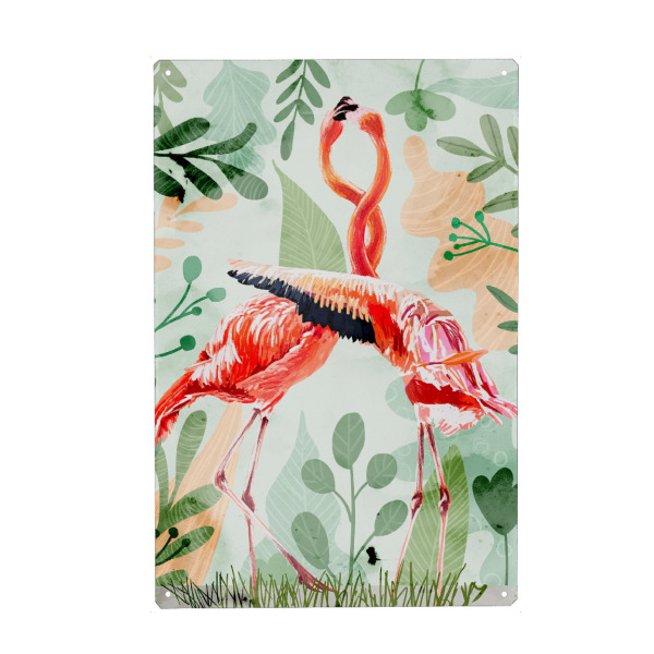 Metall Poster "Flamingo Love" artboxONE - Tiere,Liebe - Flamingo,Tropical,Nature,Animal,Bird,Travel,Exotic,Leaves,Blush,Red,Pink,Mint,Green,Love