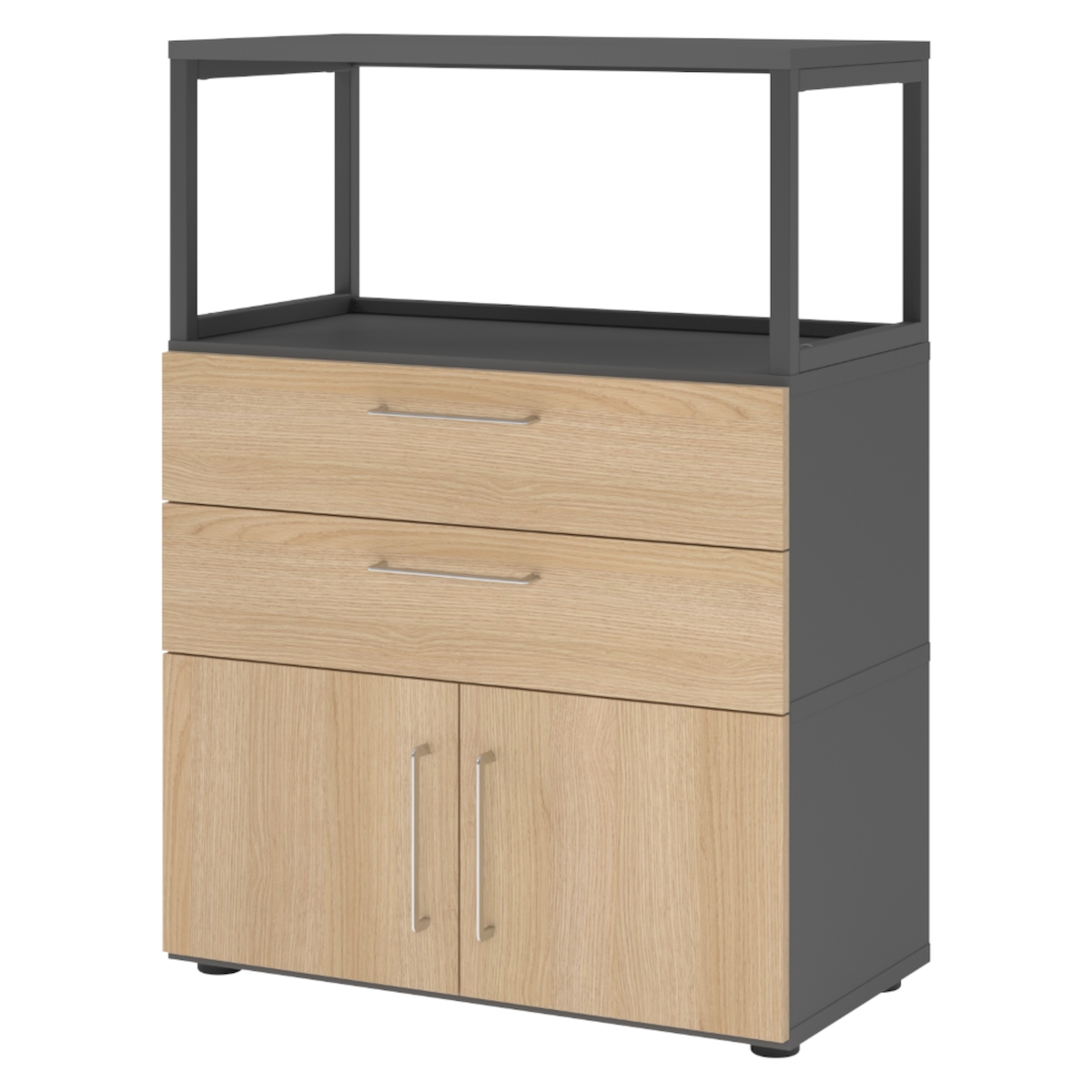 bümö flexi Schrank mit Flügeltüren, Regal & 2 Schubladen in Graphit/Eiche, Büroschrank mit werkzeuglosem Schnellmontage-Klicksysten in modularer