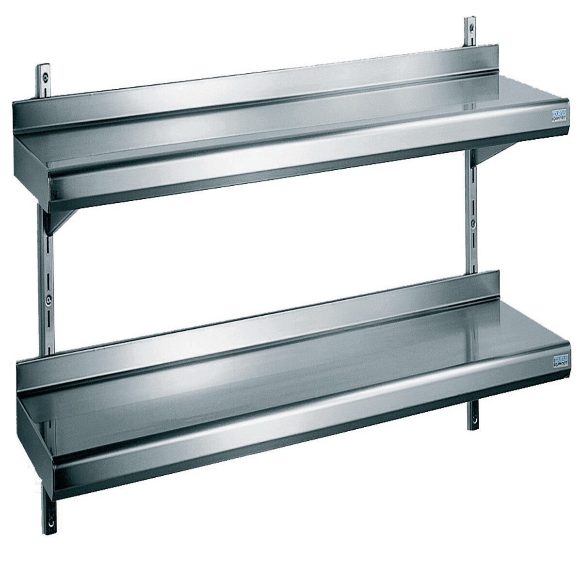 Tournus Edelstahl Wandregal mit 2 Ebenen mit Regalschiene. L x T x H: 1000 x 390 x 315 mm. Aufkantung hinten Höhe 50mm. Stärke Regalboden: 1,2mm.