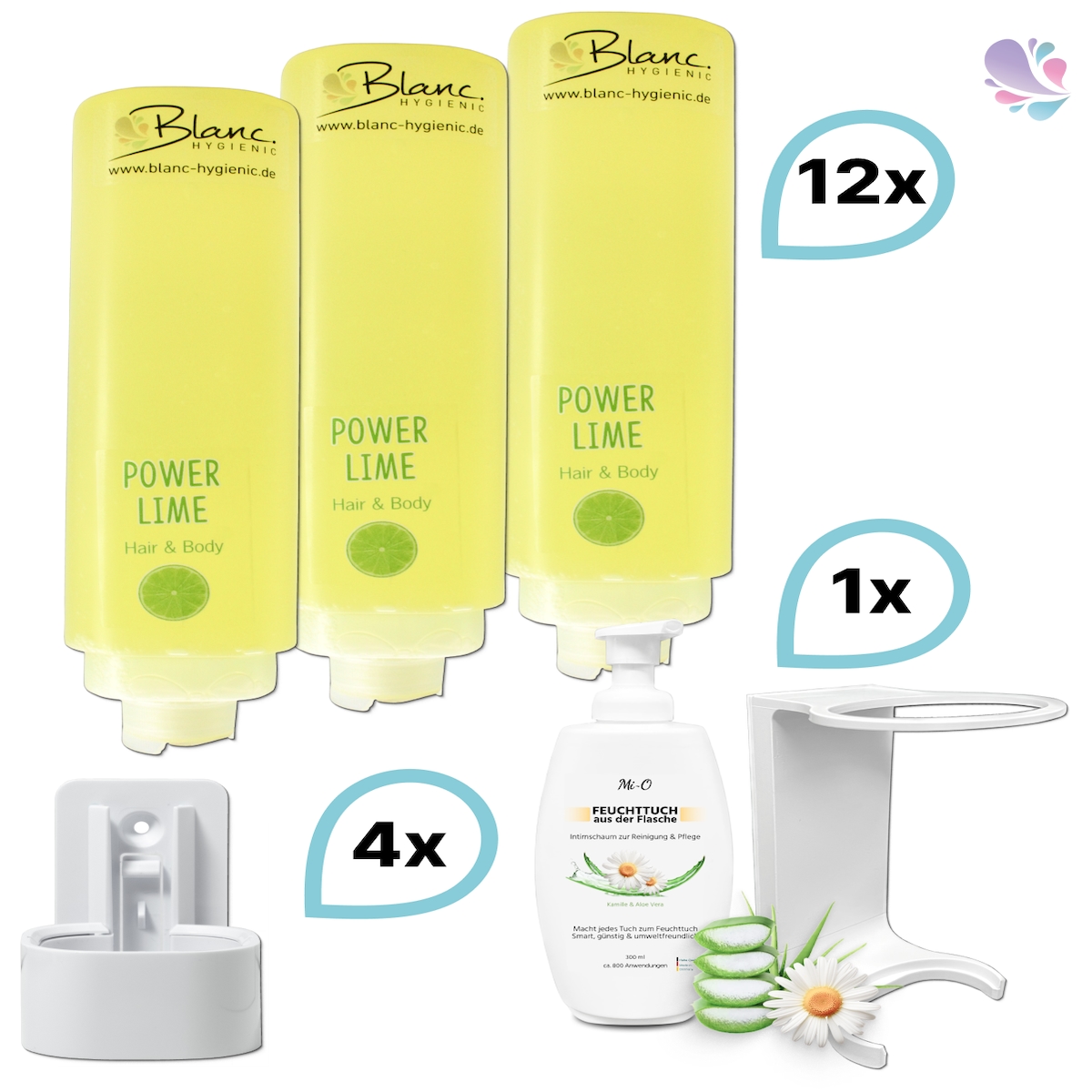 Blanc HYGIENIC KOMPLETT-SET Duscherlebnis 12x425ml verschied. Düfte, 1x300ml Intim Reinigungsschaum+ 5x Wandhalterung : Duftnote - Power Lime: Limette