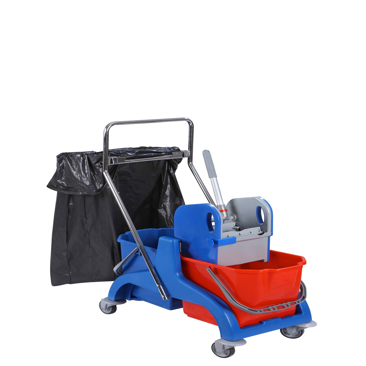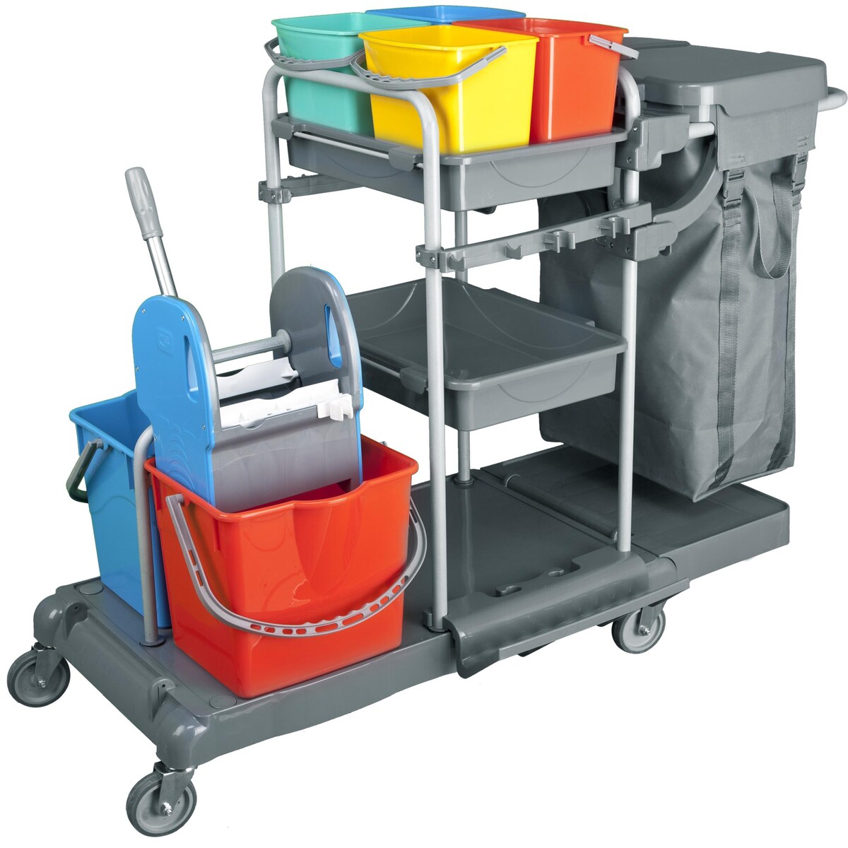 CleanSV BAY Servicewagen PE, Reinigungswagen. 2 x 16 Liter Eimer mit Abfallsammler Mülltrennung, 2 x 6 L. Eimer, Moppresse