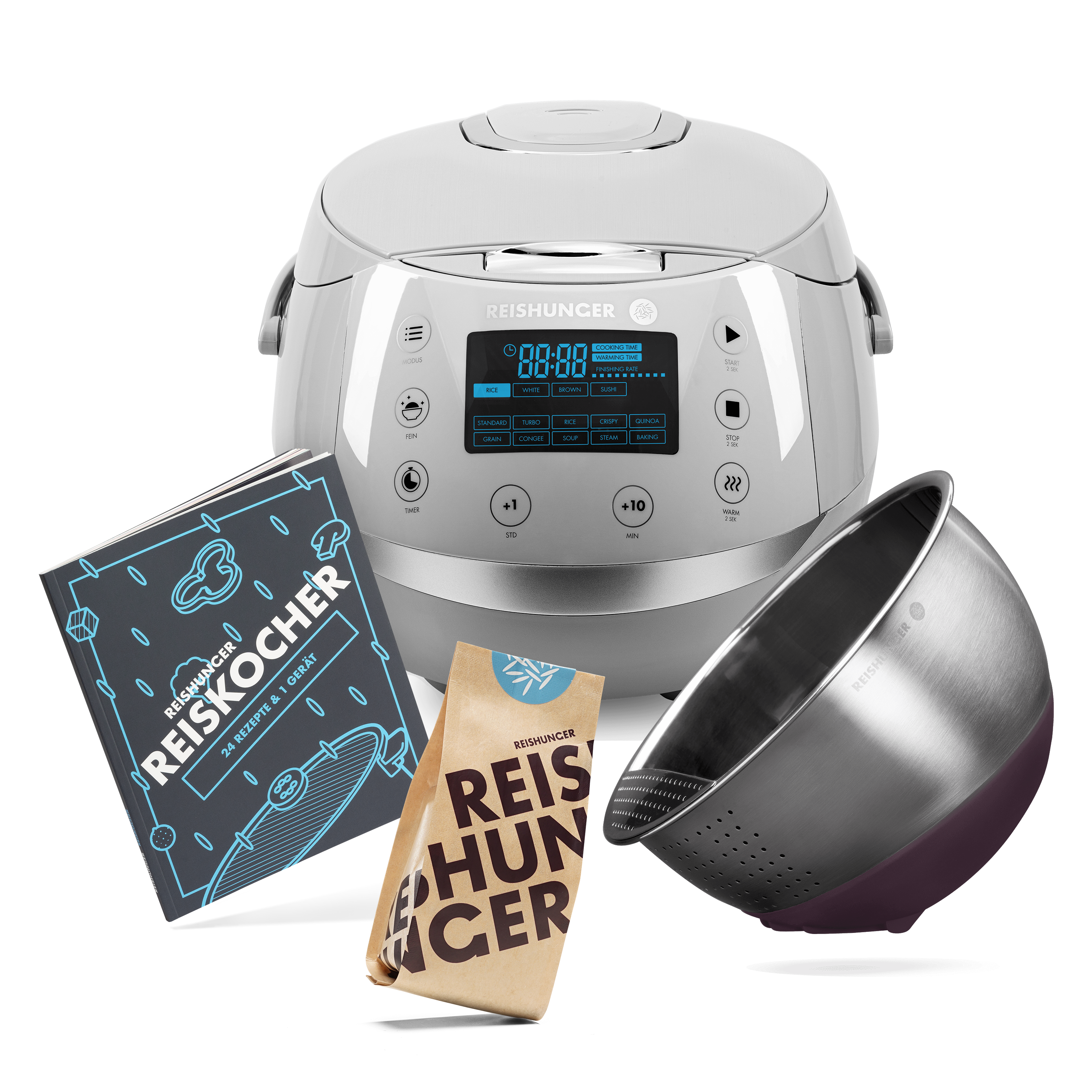 Reishunger Digitaler Reiskocher Set (1,5 l) | Grau | 12 Programme | Reis kochen für 8 Personen