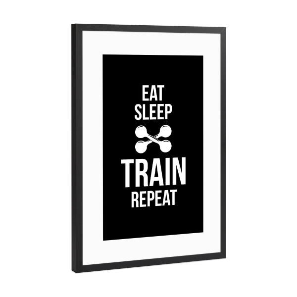 Poster mit Rahmen Schwarz (Metallic) "Train Repeat" artboxONE - Typografie,Schwarzweiß,Sport,Sport / Motivation