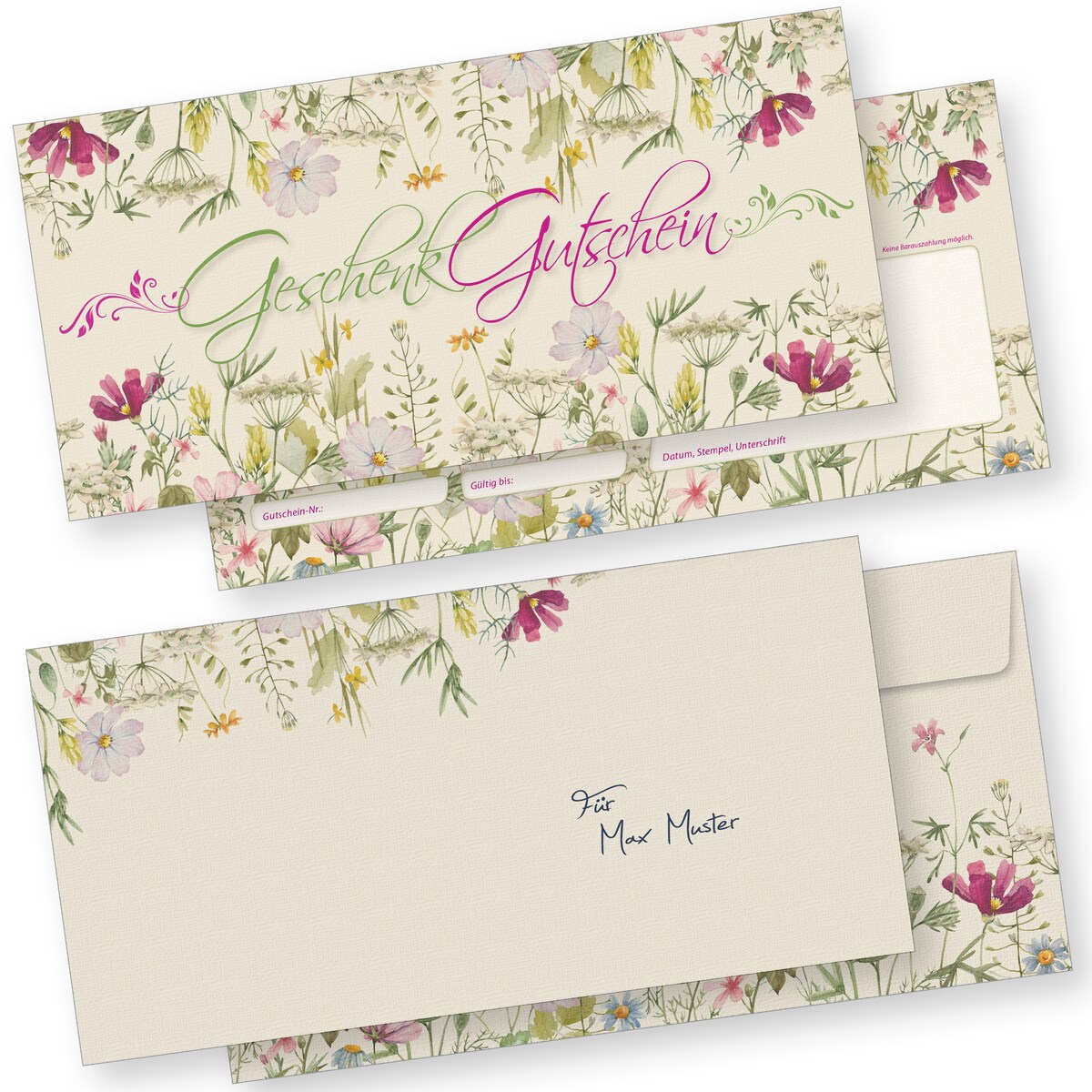 TATMOTIVE Gutscheine Gastro Restaurant mit Umschläge Wildblumen 100 Stück - Gutscheinkarten mit Blumen für Gewerbe wie Wellness Floristik