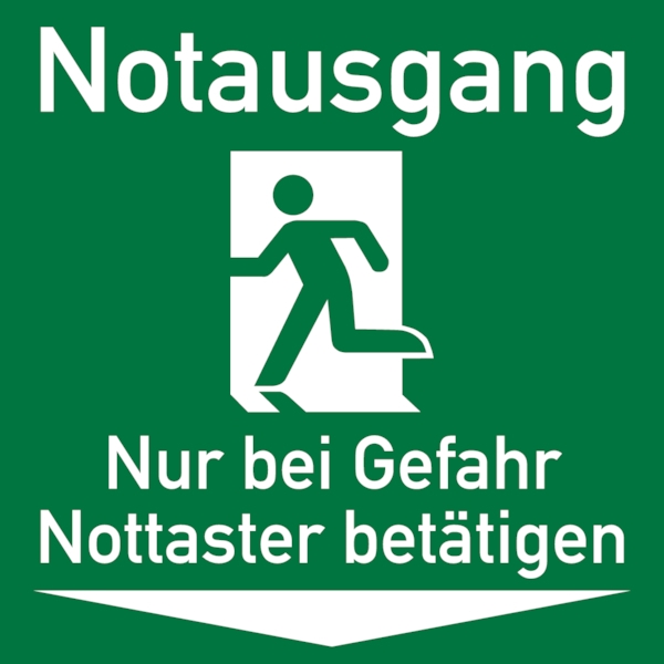 Rettungszeichen, Notausgang Nur bei Gefahr Nottaster betätigen - praxisbewährt - 150x150 mm Folie selbstklebend, nachleuchtend