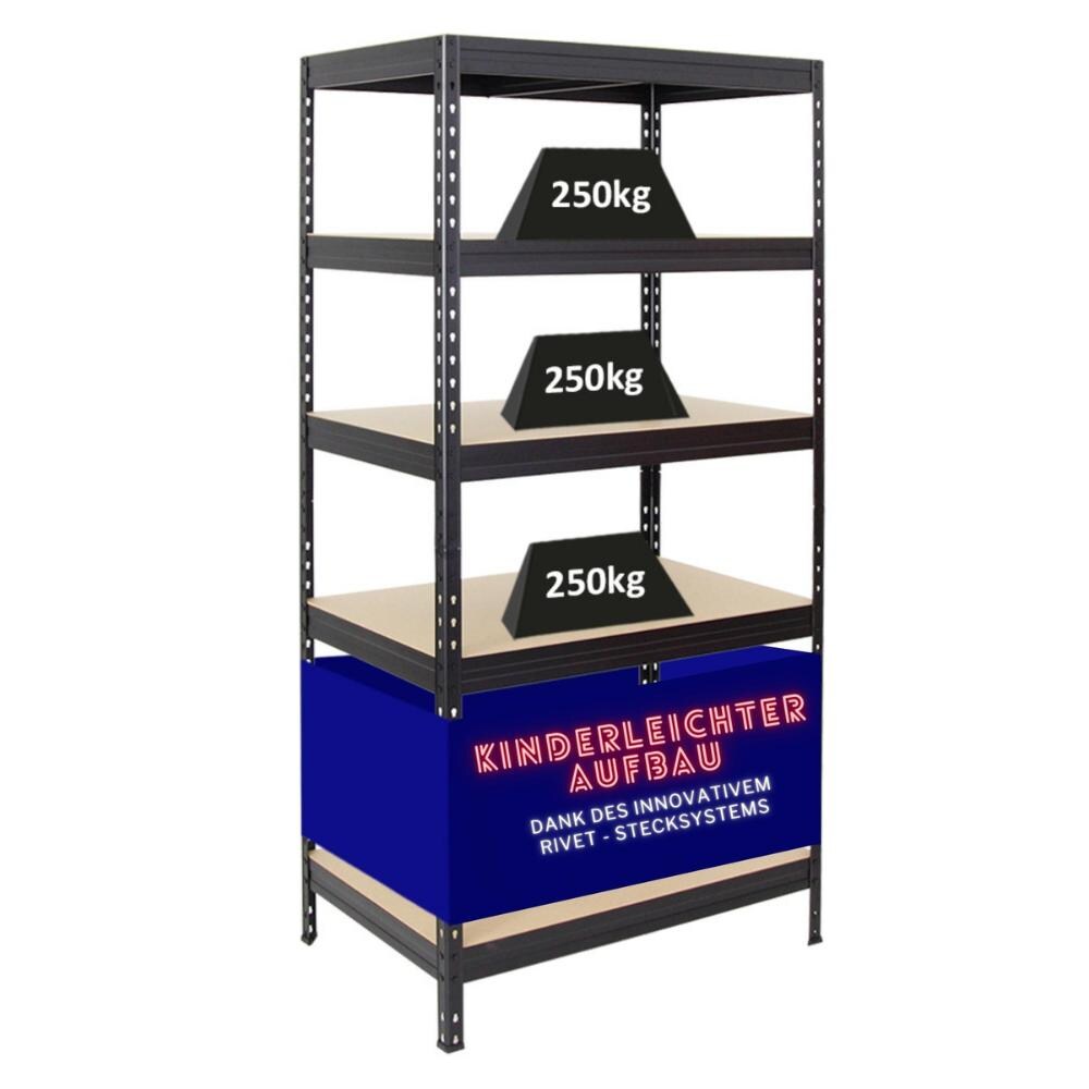 PROREGAL Schwerlastregal Rivet HxBxT 180x90x60cm Fachlast 250kg, Innovatives Stecksystem, Schwarz, Garagenregal, Lagerregal, Steckregal, Kellerregal