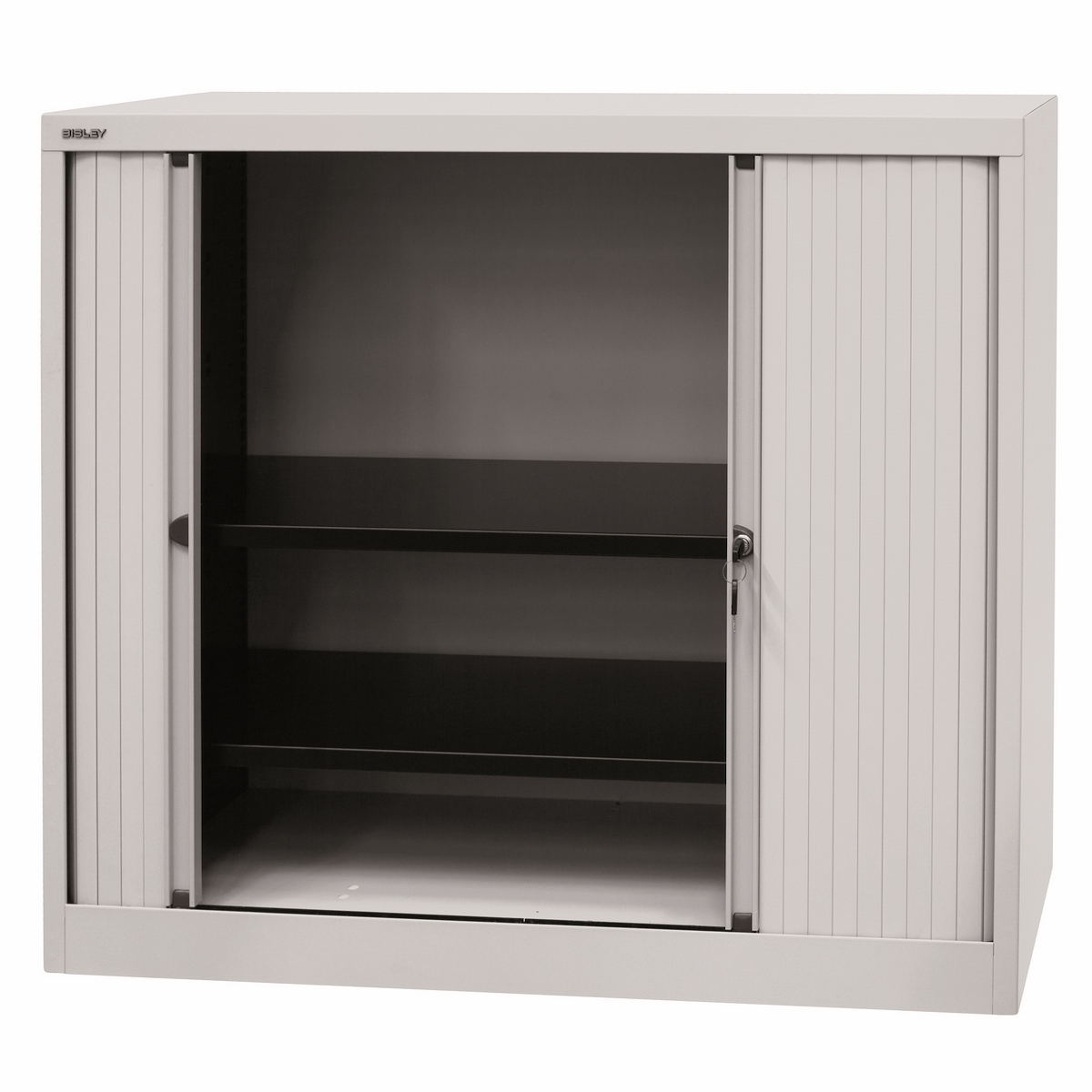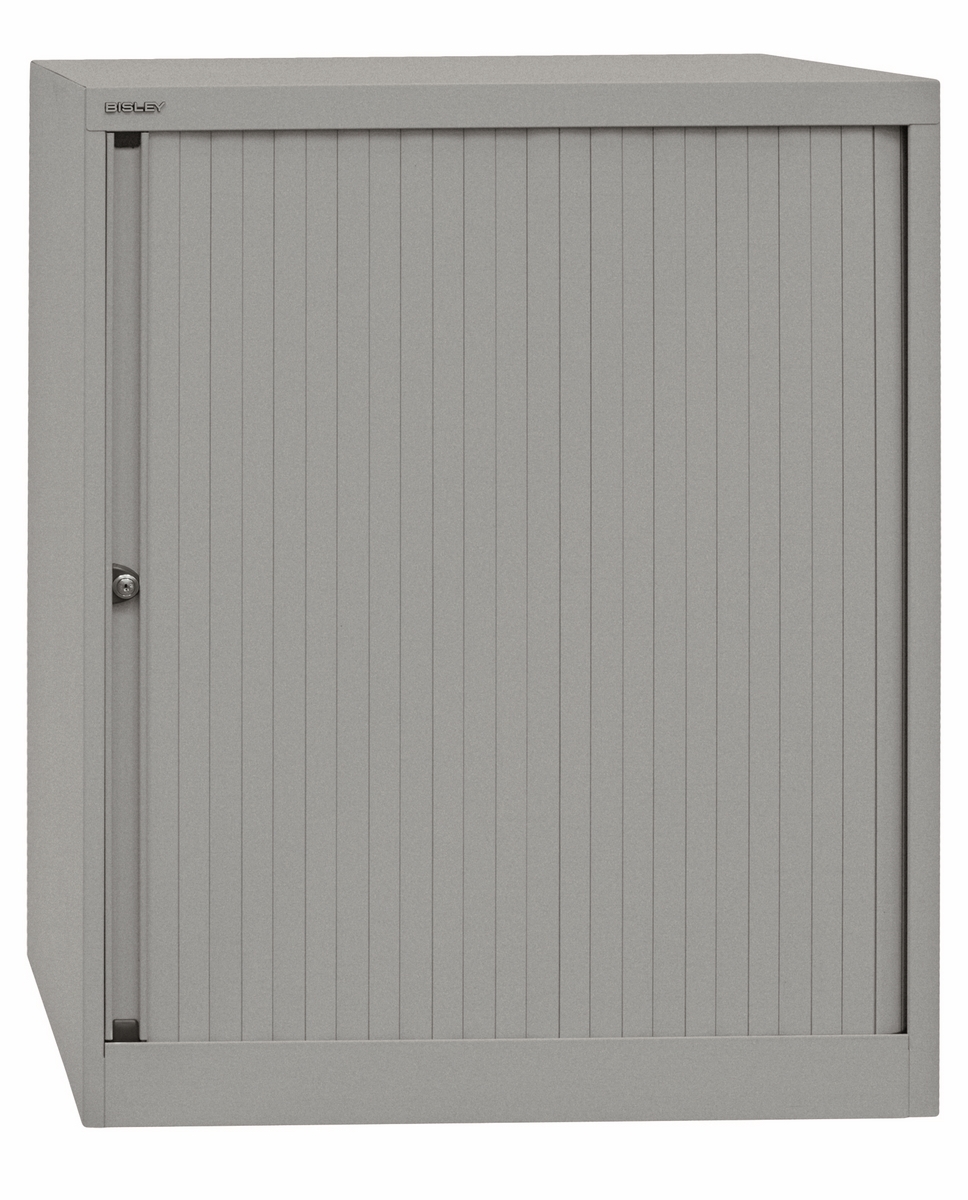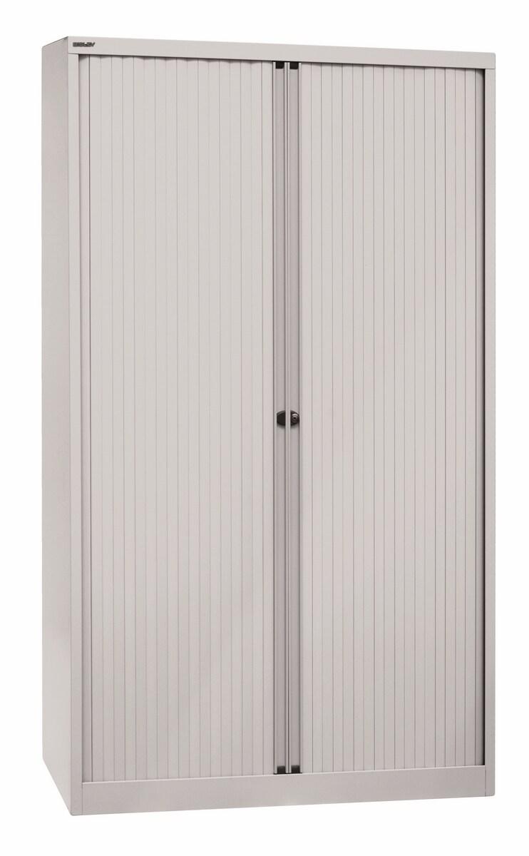 BISLEY Rollladenschrank abschließbar in lichtgrau Schrank aus Metall Rolladen aus Kunststoff inkl. 2 Einlegeböden