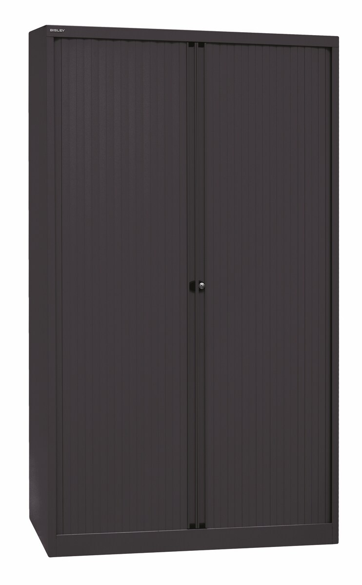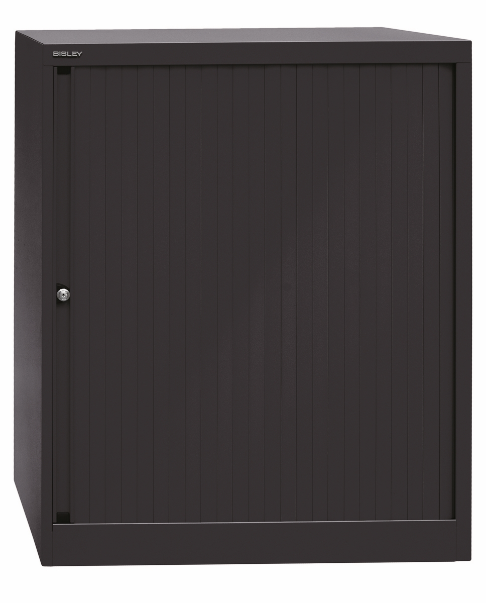 BISLEY Rollladenschrank abschließbar in schwarz Schrank aus Metall Rolladen aus Kunststoff inkl. 4 Einlegeböden