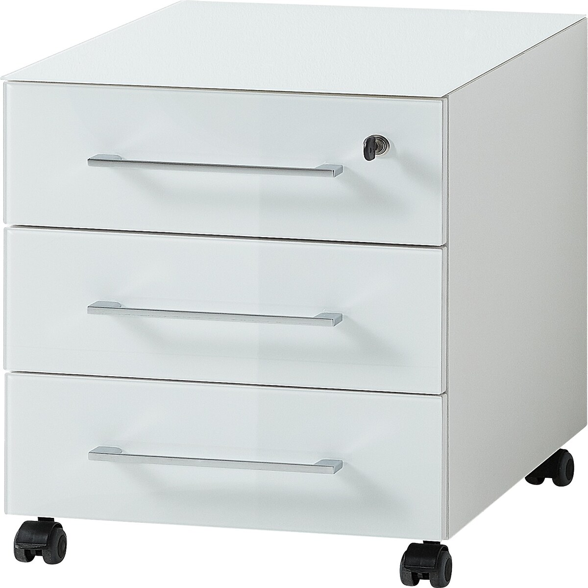 Rollcontainer 40x50x55 cm | 3 Schubladen Soft-Close & Abschließbar | Glasfront ESG Weiß | Made in Germany | Serie `Munchen` Kadima Design