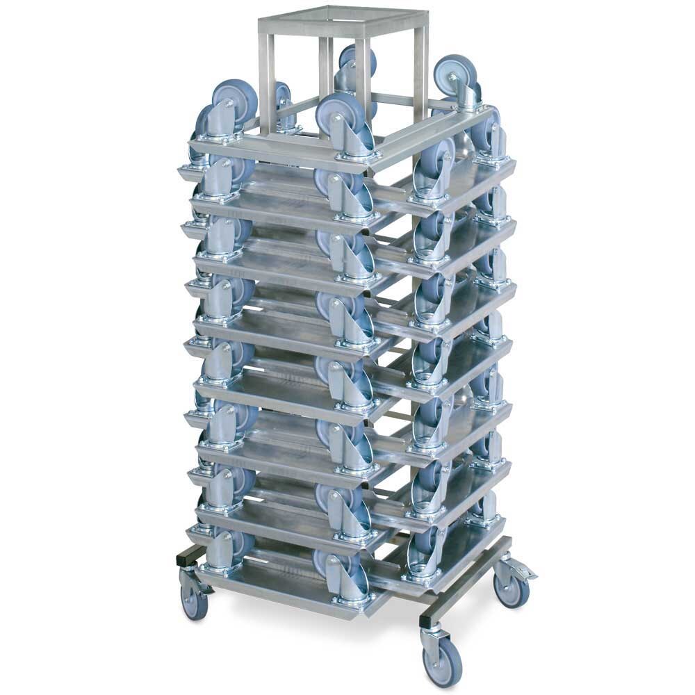15 Logistikroller f. Behälter 600 x 400 mm (250 kg Tragkraft) + Rollerständer aus Edelstahl