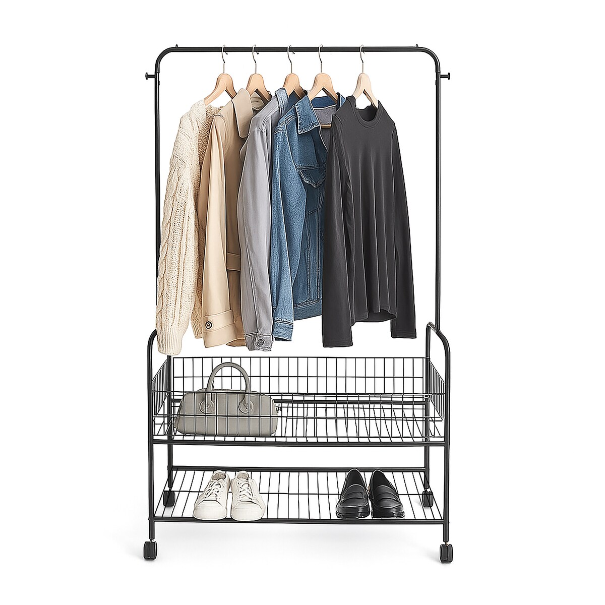 Relaxdays Rollgarderobe, mit 2 Ablagen f. Schuhe, Taschen, Accessoires, Haken, Metall, stabiler Kleiderständer, schwarz