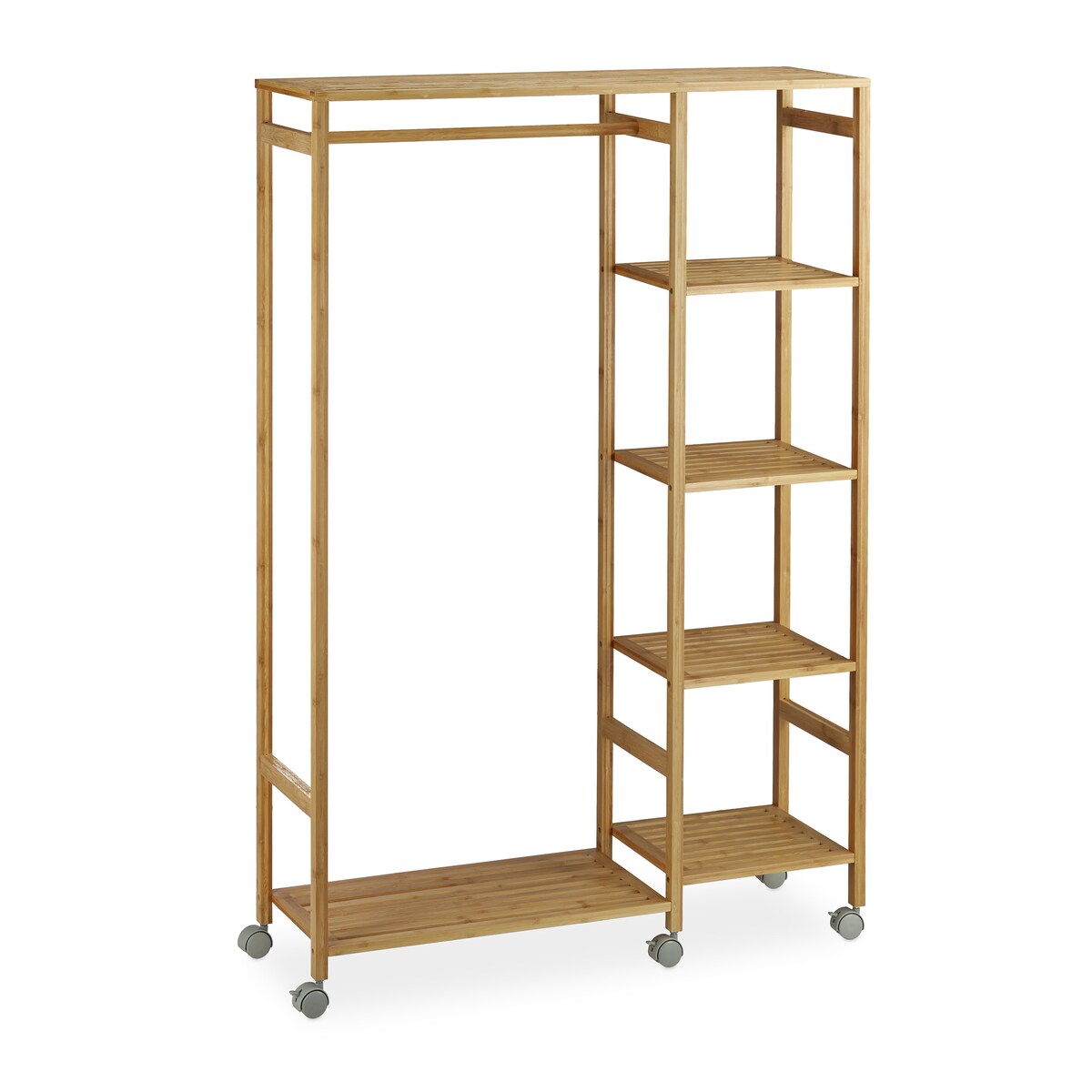 Relaxdays Rollgarderobe Bambus, mobiler Kleiderständer, 6 Ablagen, offen, Garderobenstange, HBT 136,5 x 92 x 30cm, natur