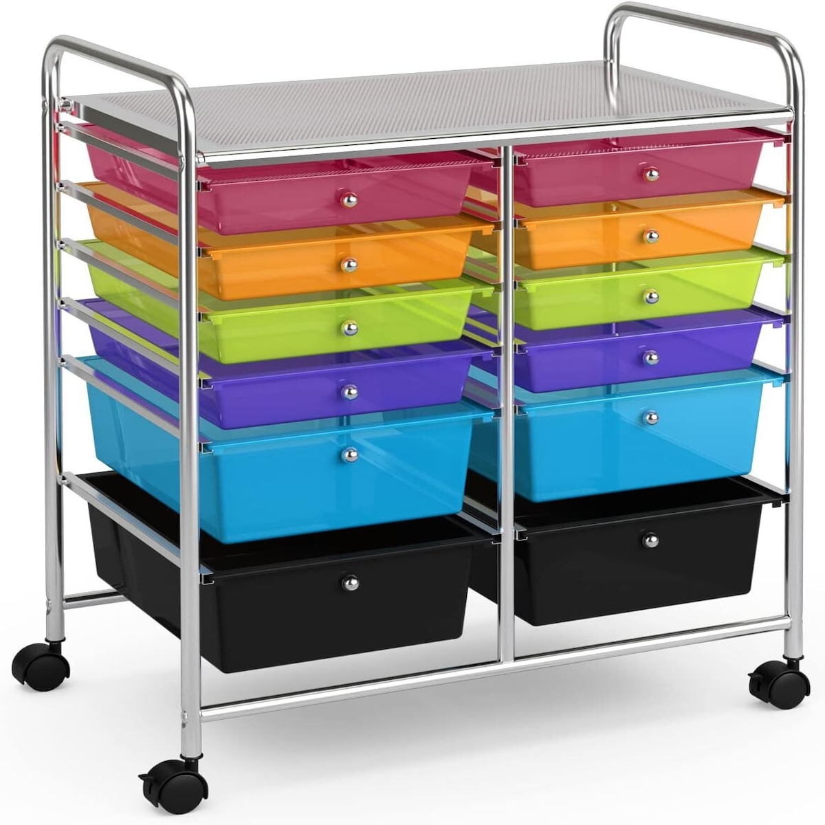 COSTWAY Rollwagen mit 12 stapelbaren Schubladen, Schubladenwagen, Rollcontainer mit Metallrahmen und Regal