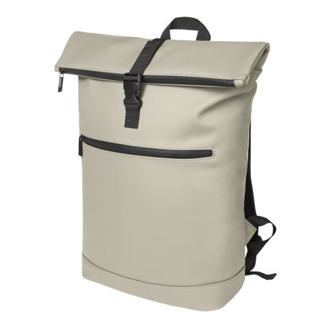 Werbeartikel Rolltop-Rucksack Thaddeus aus recyceltem Poly-Baumwollgewebe (330 g/m²) – beige – mit Logo bedruckt