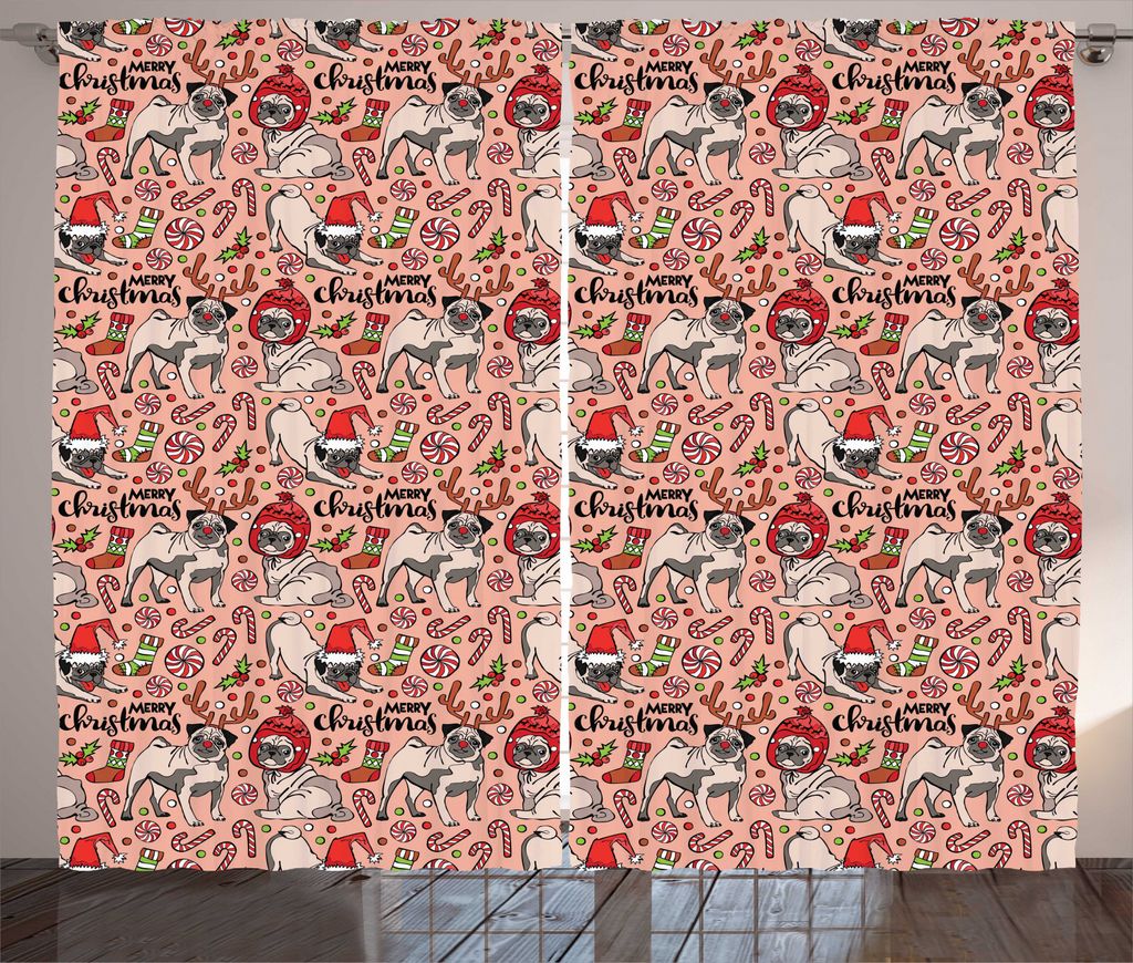 ABAKUHAUS Mops Rustikaler Gardine, Weihnachten feiern Dog, Schlafzimmer Kräuselband Vorhang mit Schlaufen und Haken, 280 x 245 cm, Rose Rot Grün