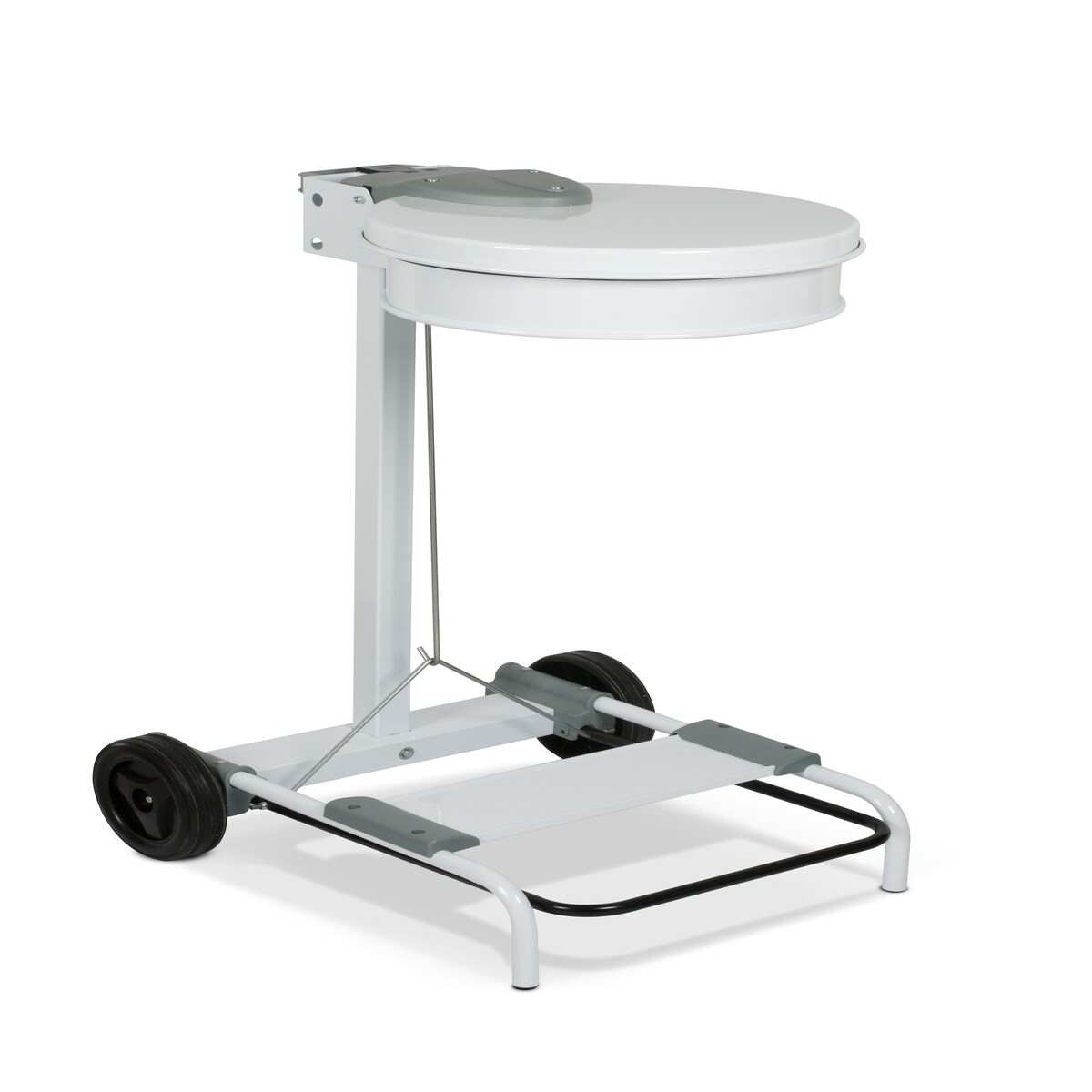 Freistehender Sackhalter bzw. Mülleimer aus Stahl, weiß, hygienischer Deckel mit Fußpedal, 880(H) x 430(B) x 330(T)mm