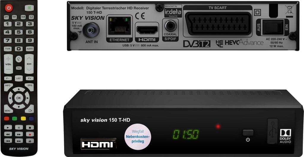 sky vision 150 T-HD, 1080p HDTV DVB-T2 Receiver, USB, HDMI, SCART, Coaxial