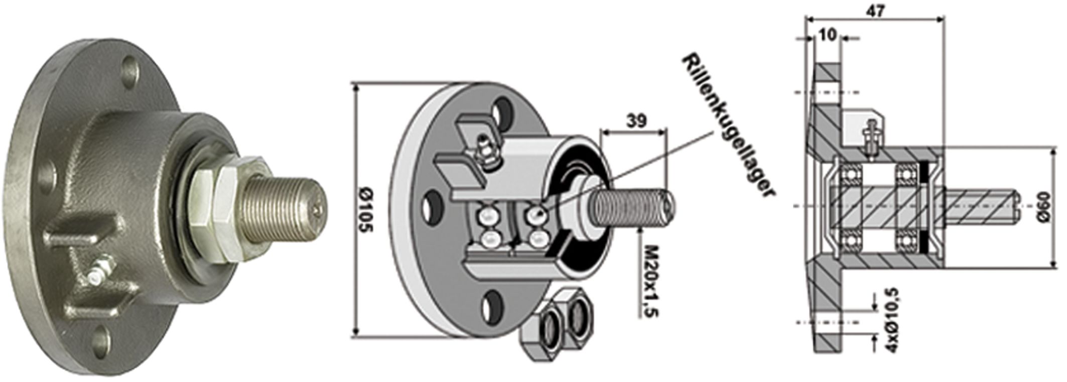 Industriehof Scheibenlager mit nach innen gewölbter Auflagefläche, Ø außen 105 mm; 60 mm, M 20 x 1,5 AG, Höhe 47 mm, Lochkreis 86 mm, 31-L1B