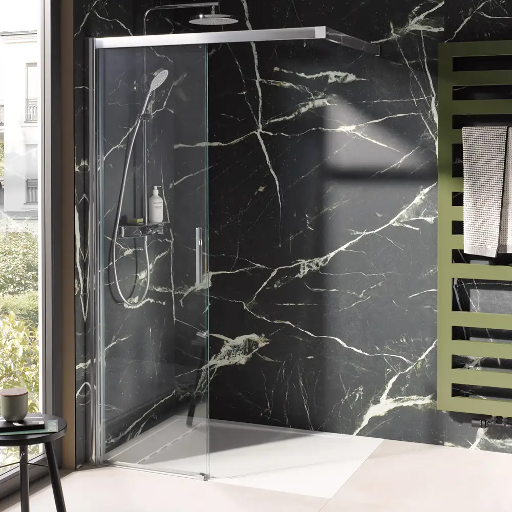 HSK gerahmte Eckeinstieg mit Schiebetür 4-teilig „Favorit“ Schiebetür Eckeinstieg 4-teilig mit Bodenprofil Glas Carré, Profile Chromoptik (Alu