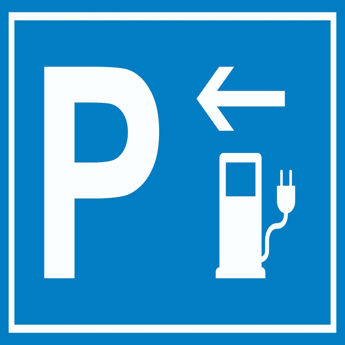 E-Auto Elektrofahrzeug Parkplatz Schild mit Richtungspfeil links waagerecht A3 Rückseite selbstklebend