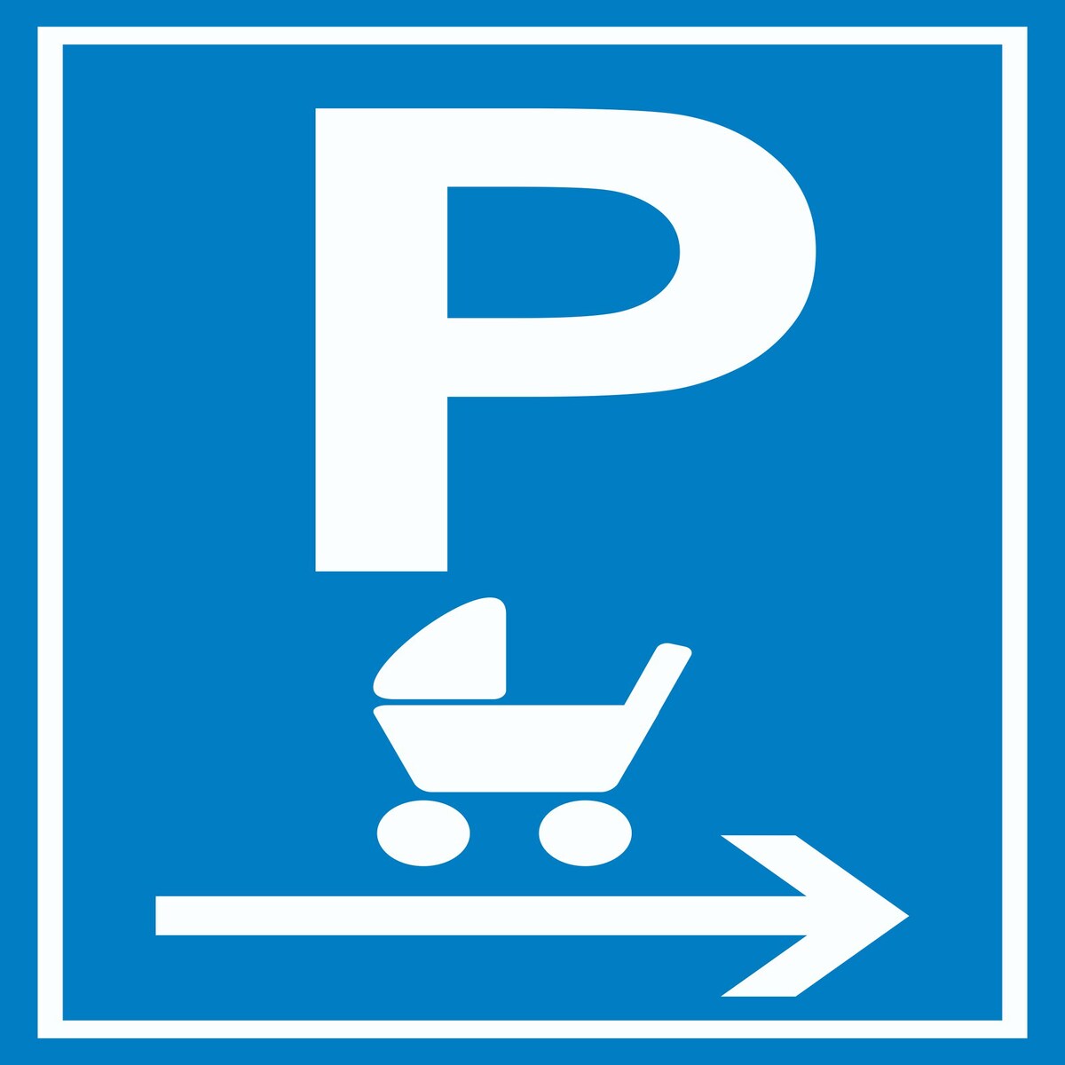 Eltern Kinderwagen Parkplatz Schild mit Richtungspfeil rechts waagerecht A6 Rückseite selbstklebend