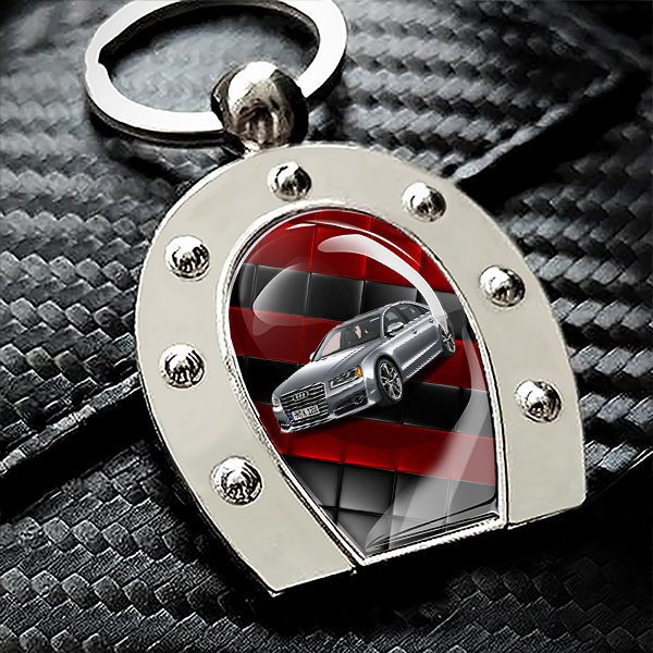 Individueller Hufeisen Schlüsselanhänger Chrom-XL mit deinem Auto u. Kennzeichen mit Rot-schwarze Kacheln Hintergrund!