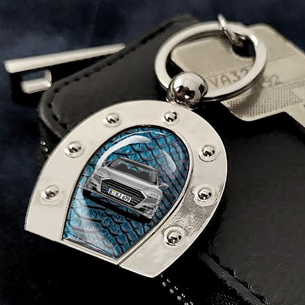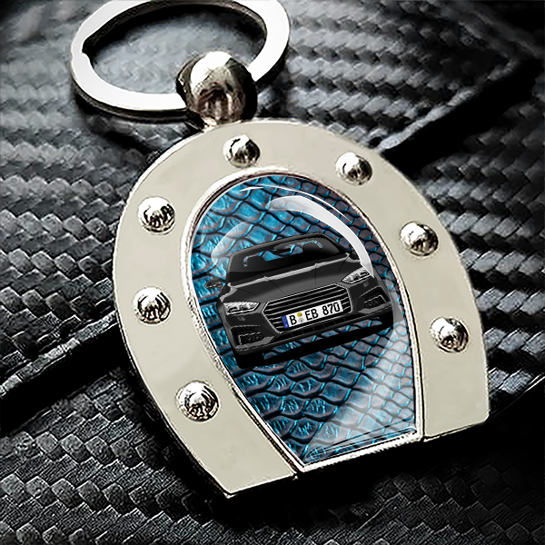 Individueller Hufeisen Schlüsselanhänger Chrom-M mit deinem Auto u. Kennzeichen mit Blaues Schlangenleder Hintergrund!