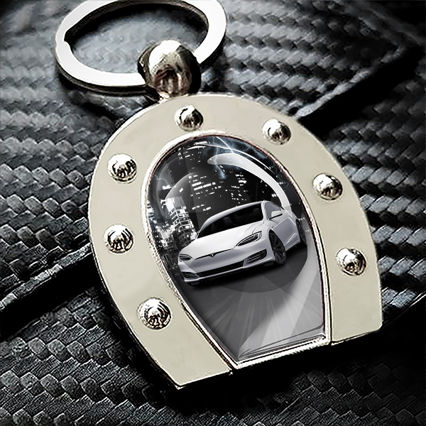 Individueller Hufeisen Schlüsselanhänger Chrom-M mit deinem Auto u. Kennzeichen mit Dunkle Stadt Hintergrund!
