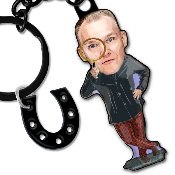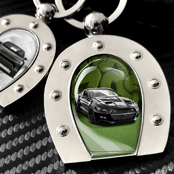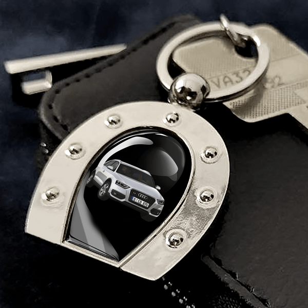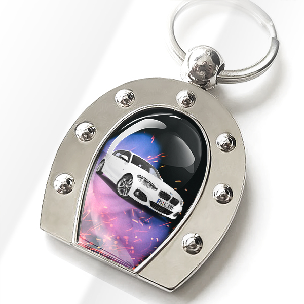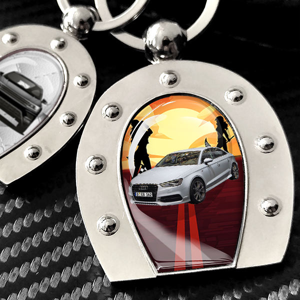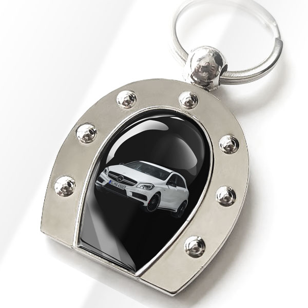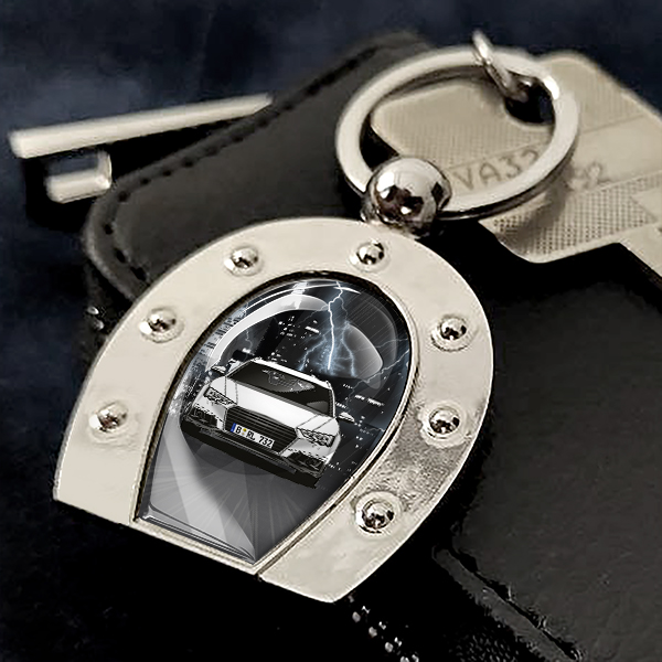 Individueller Hufeisen Schlüsselanhänger Chrom-XL mit deinem Auto u. Kennzeichen mit Schwarzem Hintergrund!